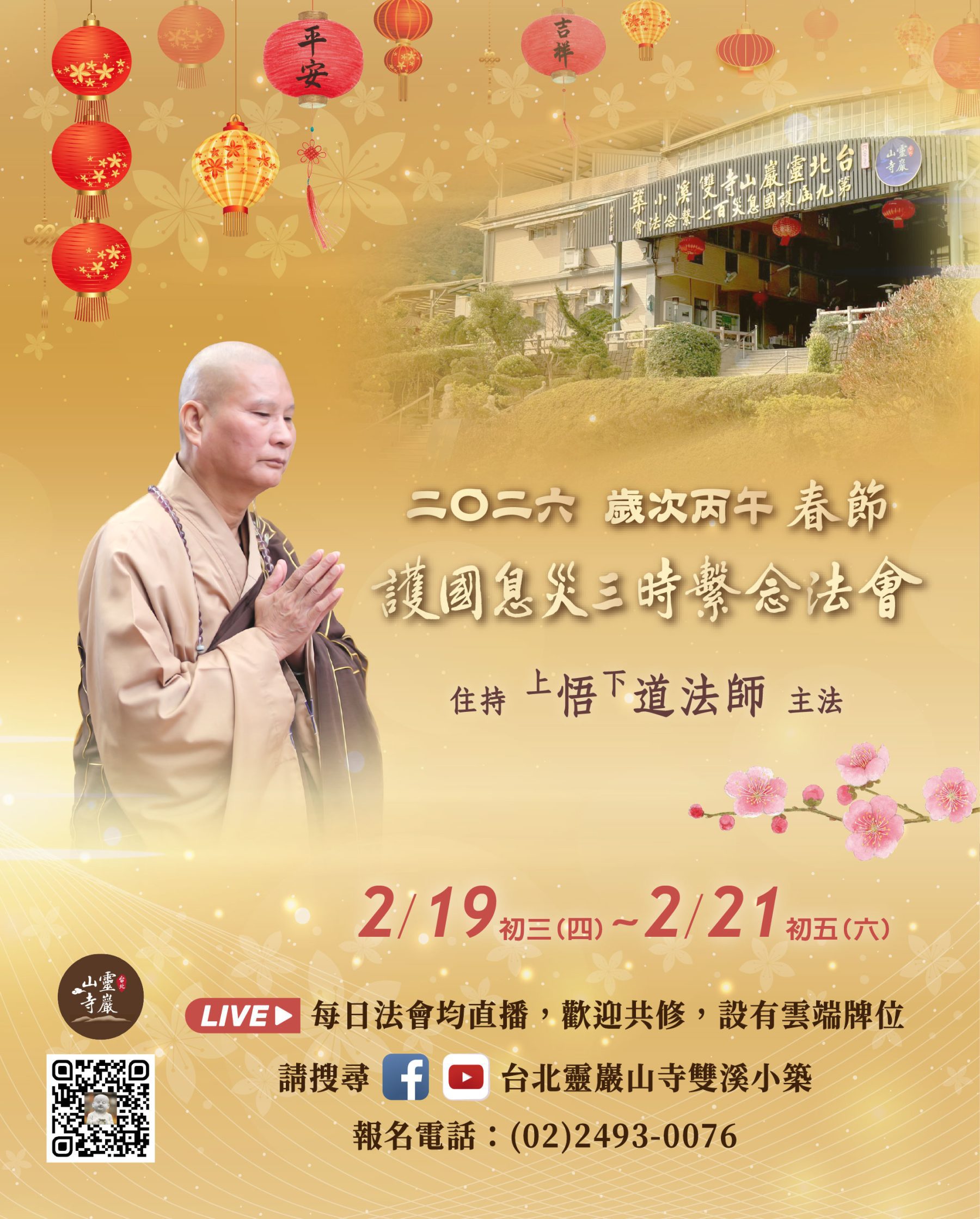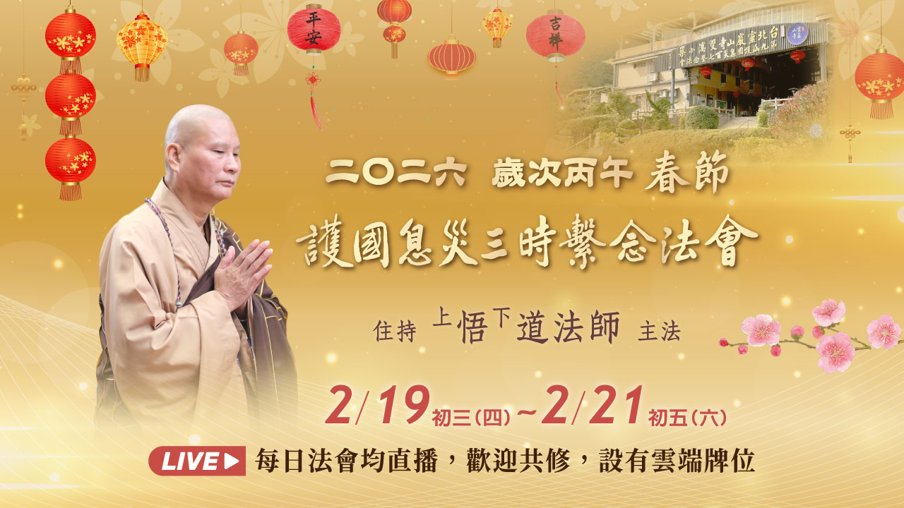 首頁 > 最新消息 > 法會講經 > 法會 > 2/19~21 線上直播共修|雙溪小築春節護國息災三時繫念法會