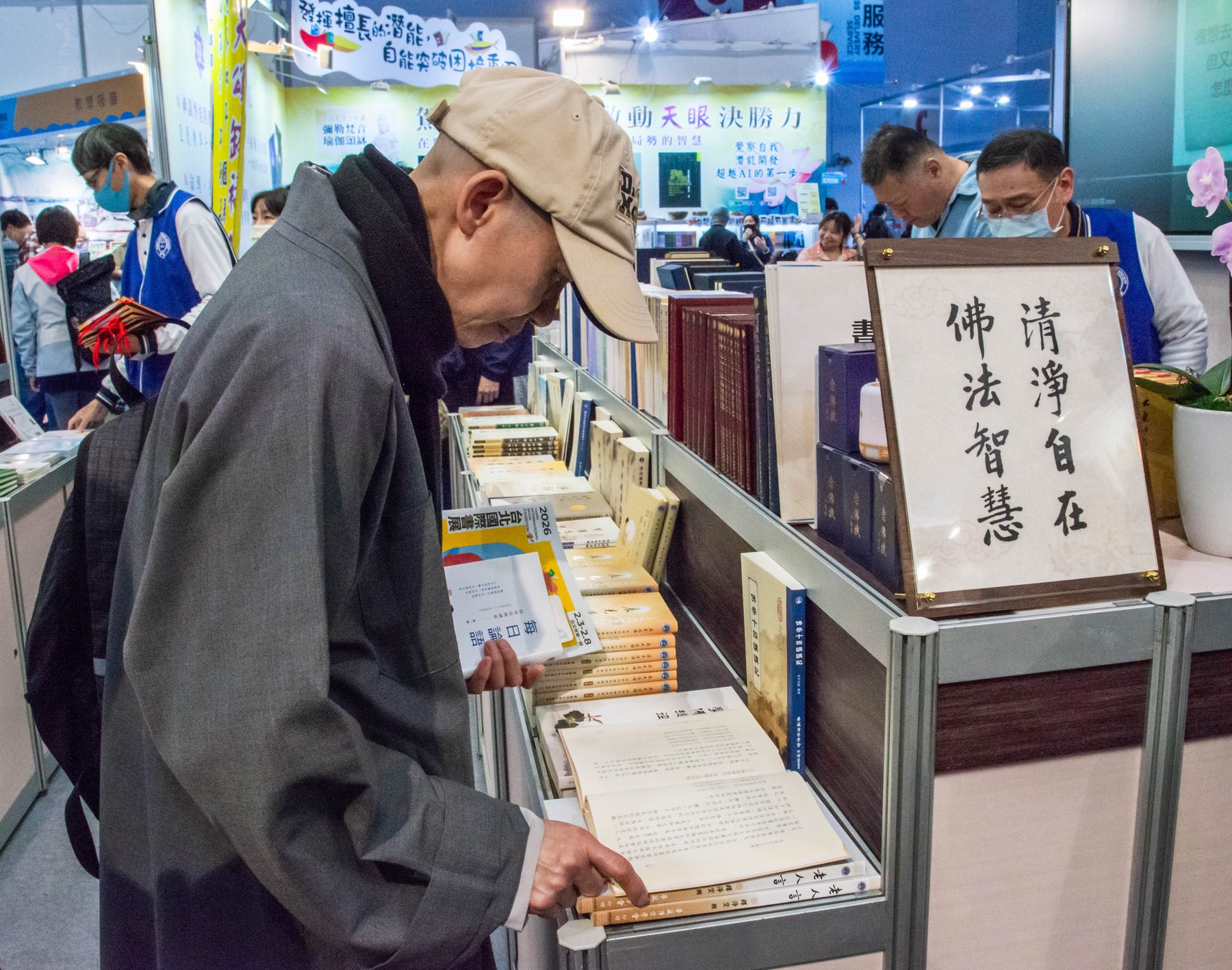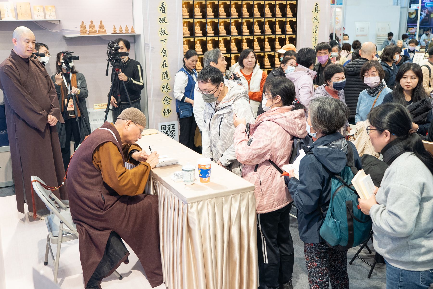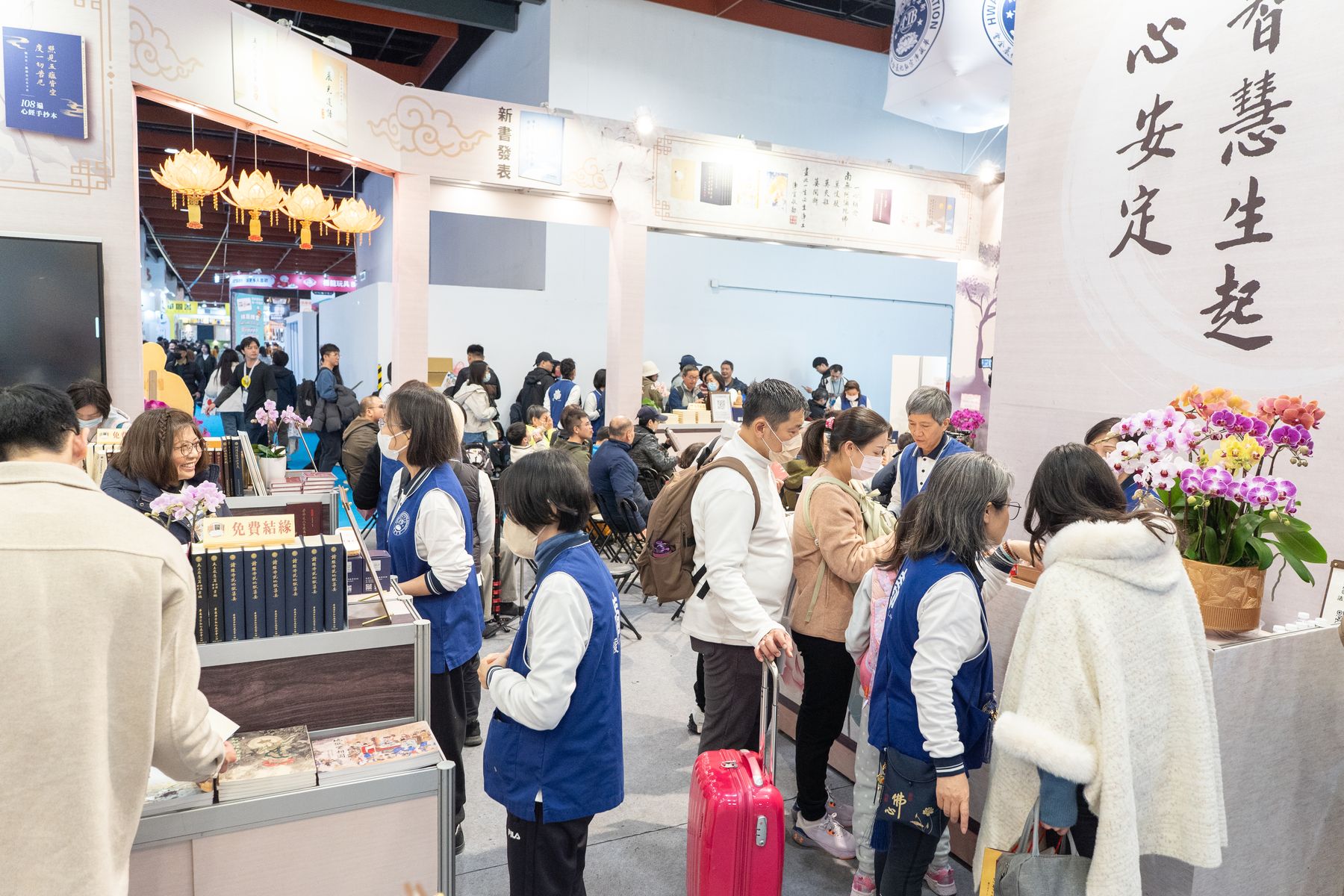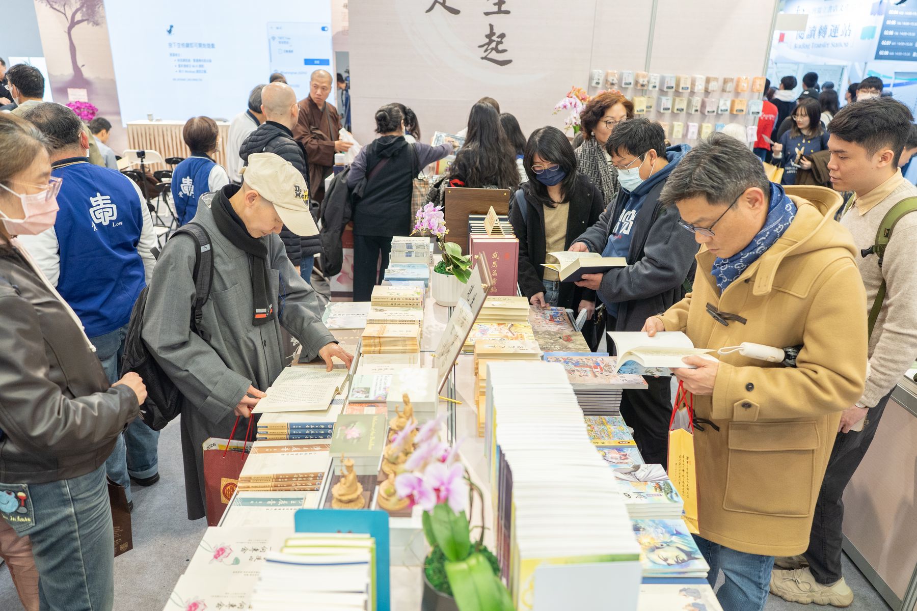 2/4(三)台北國際書展華藏展區,現場人潮絡繹不絕,氣氛歡喜且溫暖,上悟下道法師與多位貴賓親臨會場,共同見證法教的傳承與感動。