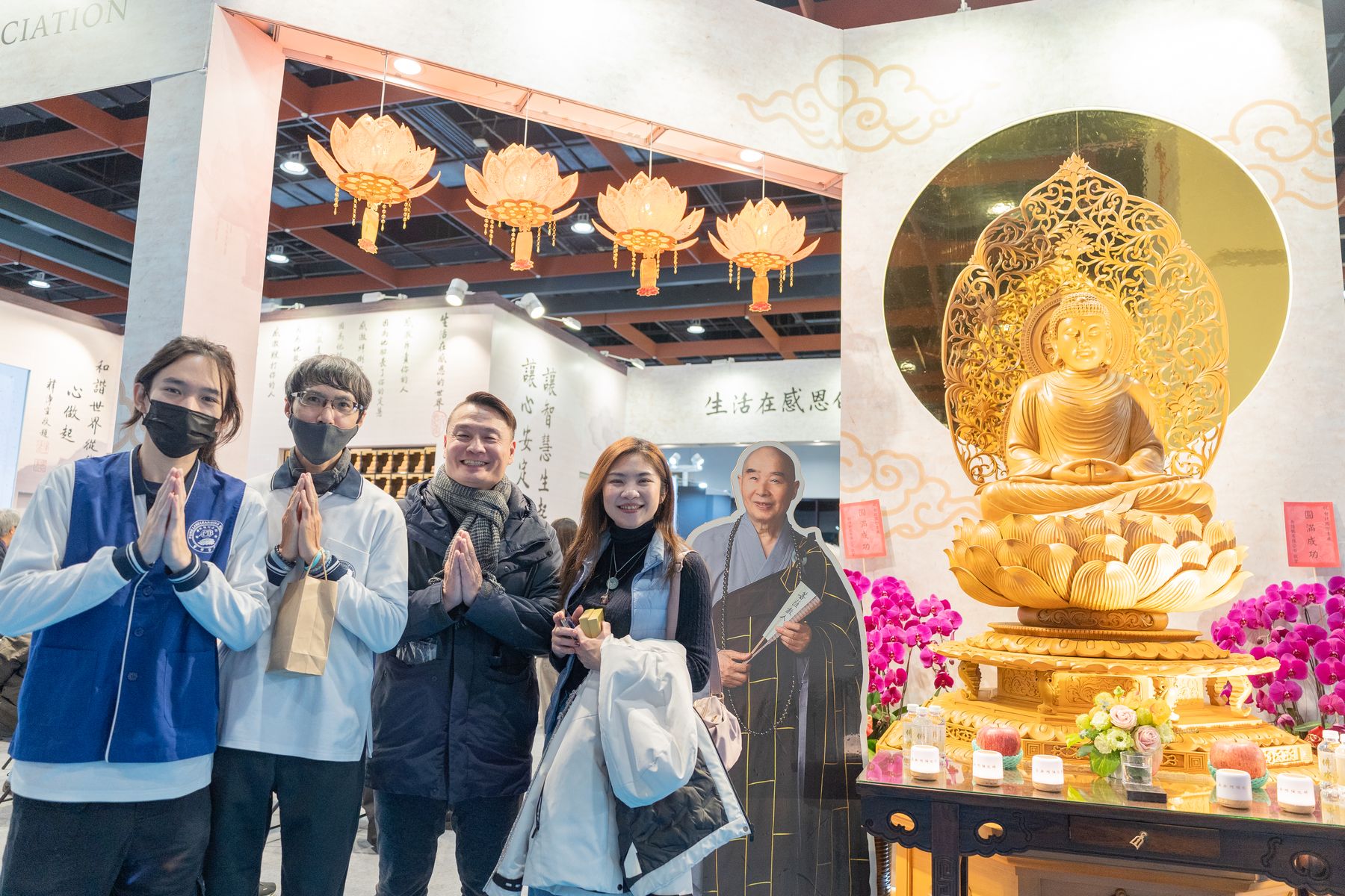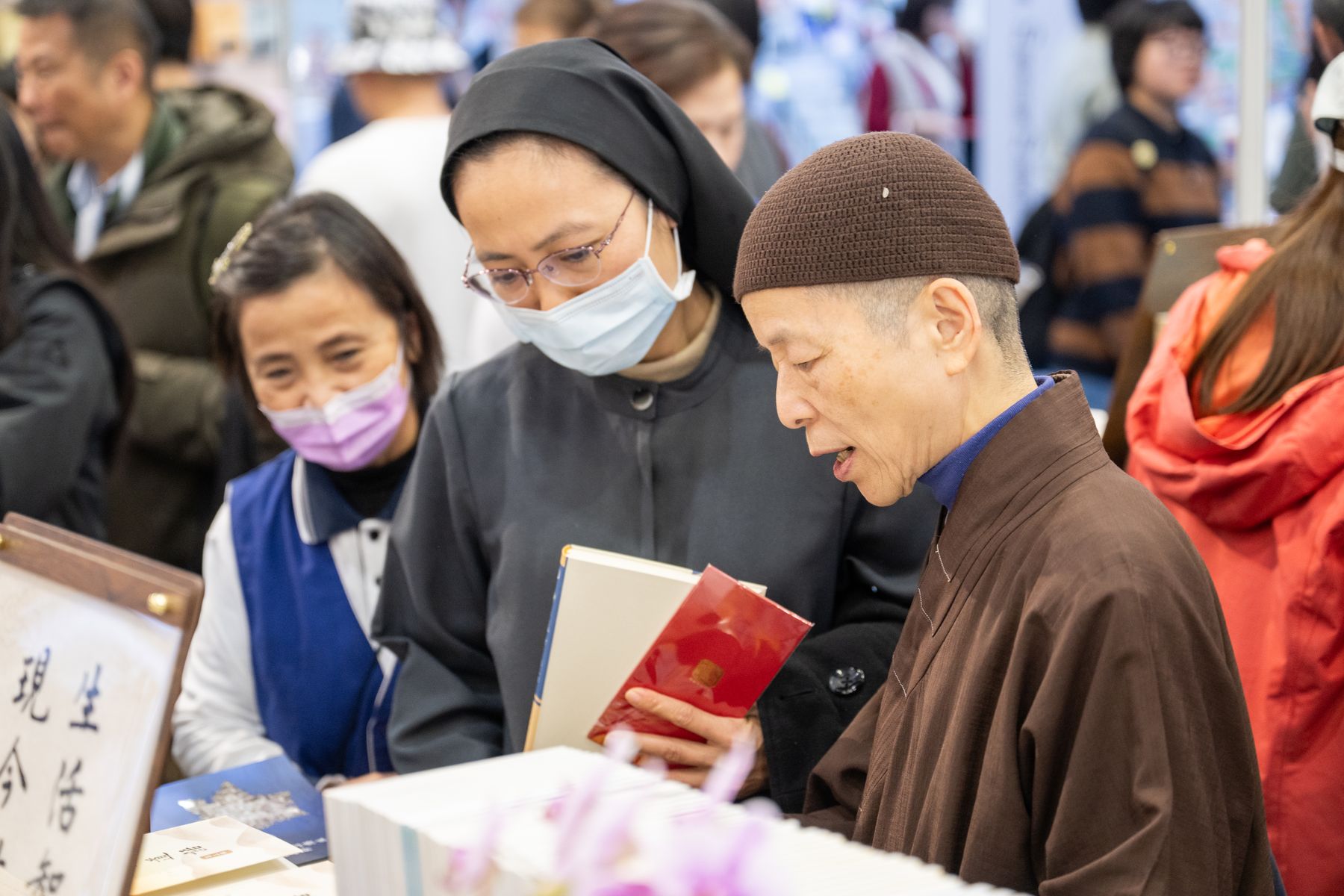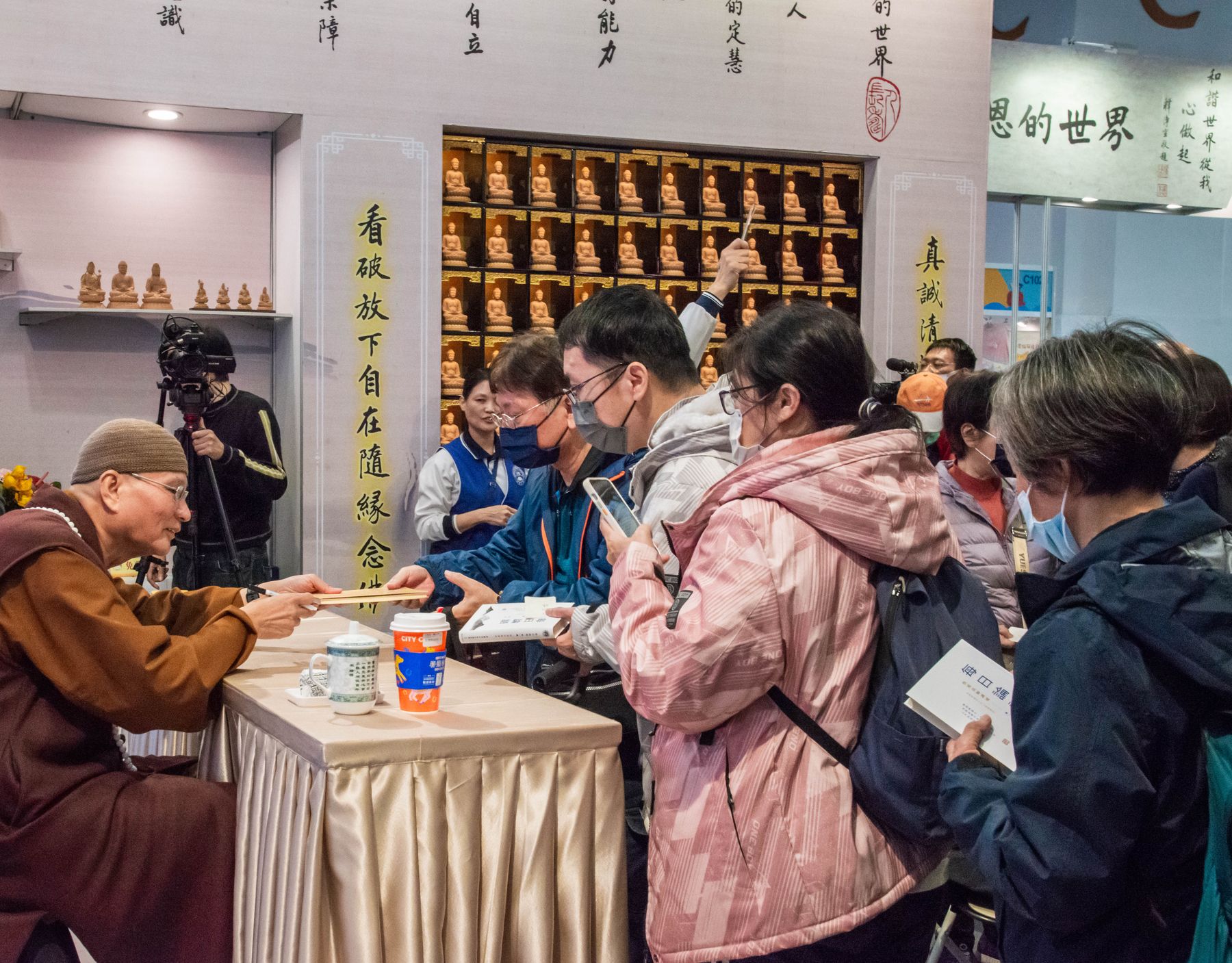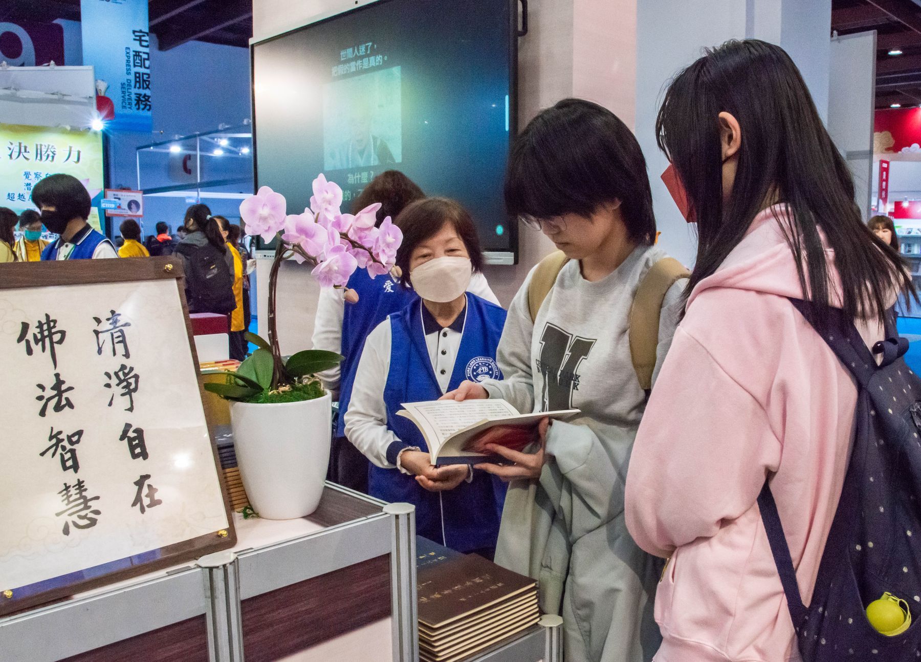 2/4(三)台北國際書展華藏展區,現場人潮絡繹不絕,氣氛歡喜且溫暖,上悟下道法師與多位貴賓親臨會場,共同見證法教的傳承與感動。