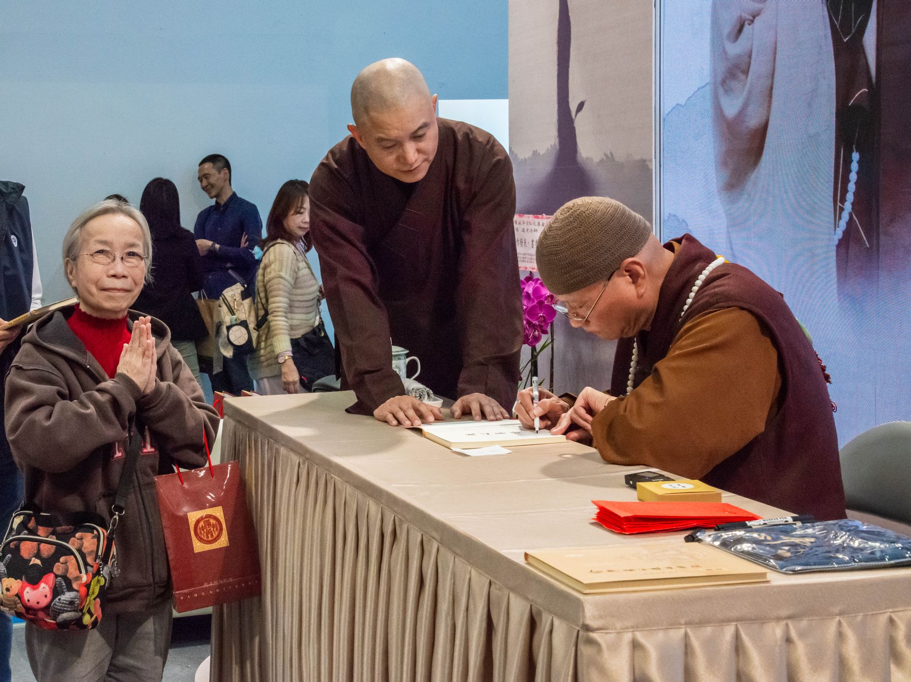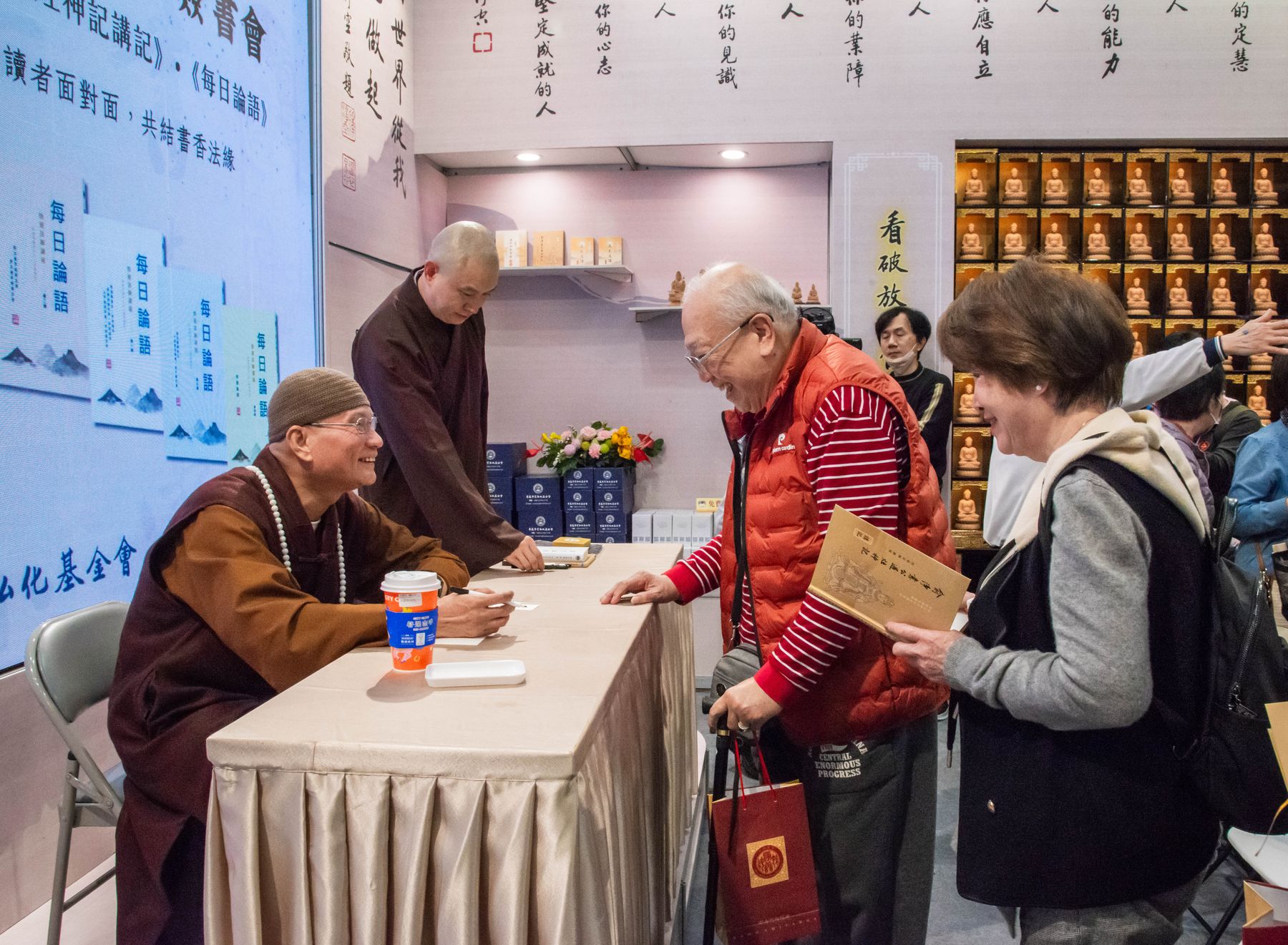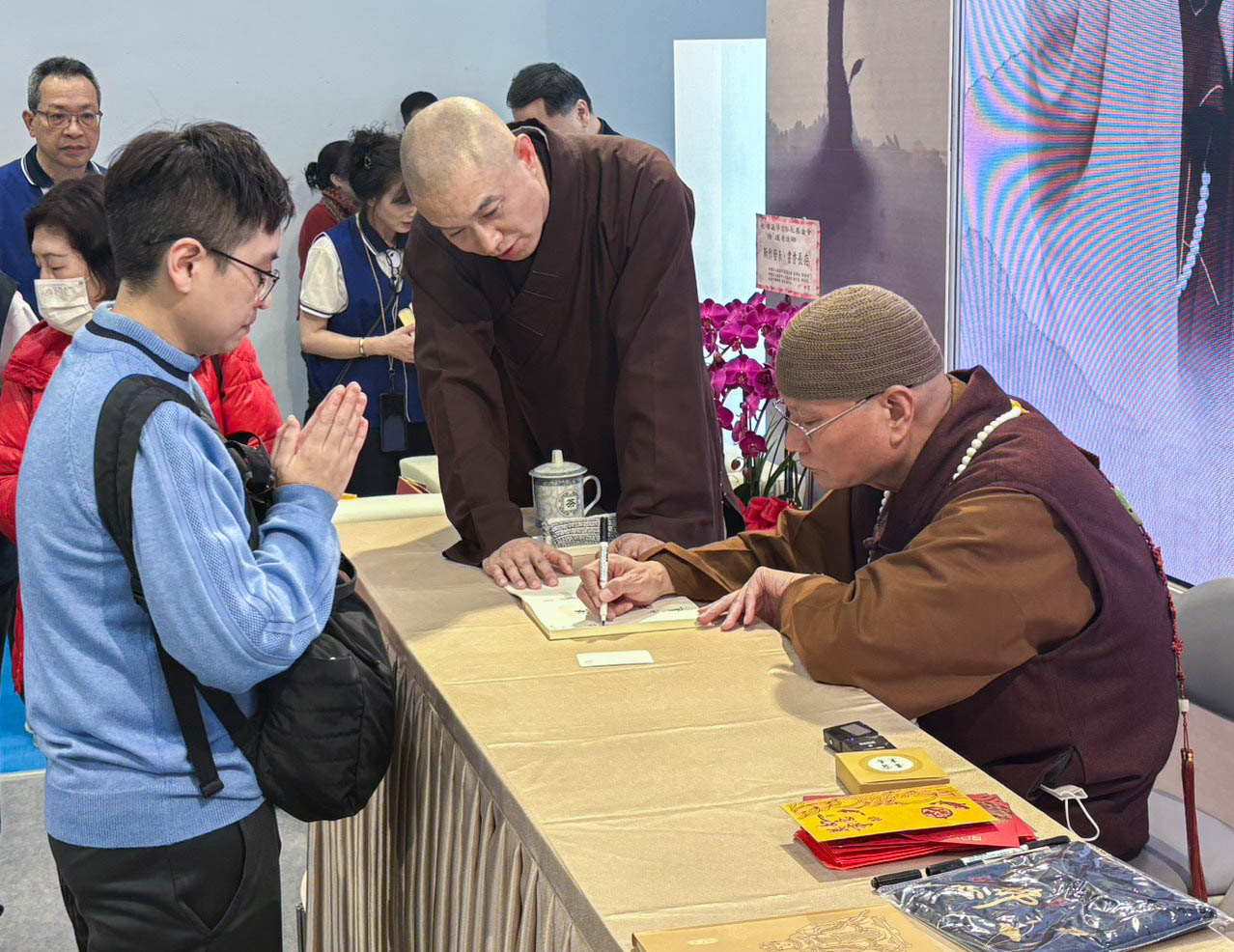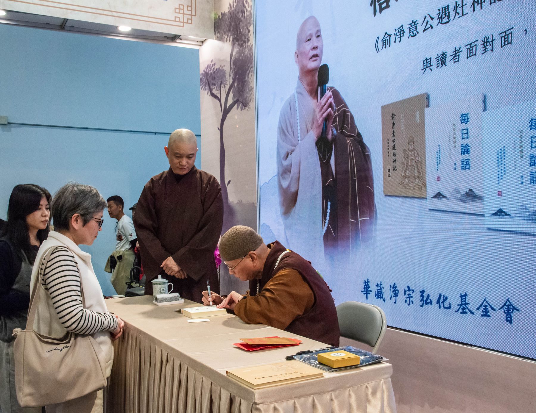 隨後舉行新書簽書會,《俞淨意公遇灶神記講記》與《每日論語》同步登場。悟道法師與讀者面對面交流,親切叮嚀修學要點,字字懇切。排隊簽書人潮綿延不斷,在書香與法語交織中,共結殊勝法緣,為今日書展畫下溫暖而深刻的句點。